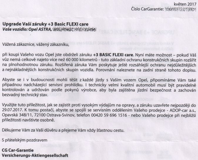 Z Německa jsem dostal obyčejný dopis (viz. obrázek), že si můžu rozšířit tu +3 BASIC FLEXI care záruku na plnohodnotnou. Co tak matně pamatuji, tak si ji někteří brali už při koupi auta (asi 8tis.), ale cenu v dopise nezmiňují. Bude stejná?