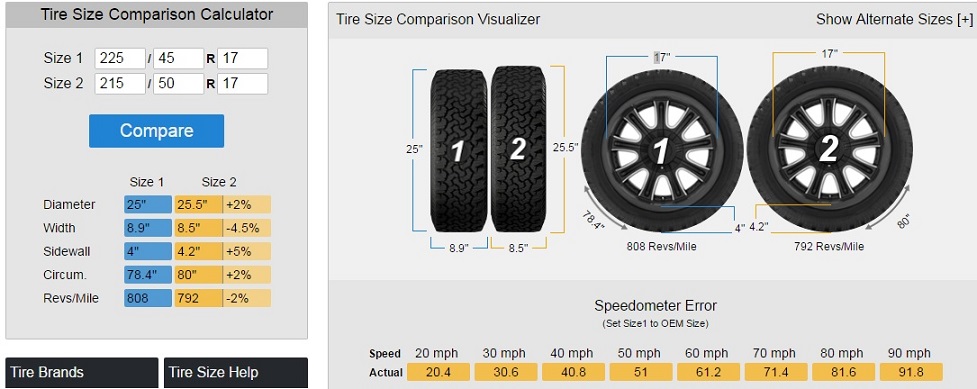 Nemyslim 16" vs 17" ale 225/45/R17 vs 215/50/R17 - podla mojho technicaku mozem mat oba rozmery. Rozdiel v obvode je 2%. Neviem ci 2% z obvodu urobia 2% v rychlosti, ak ano tak je to zanedbatelny rozdiel