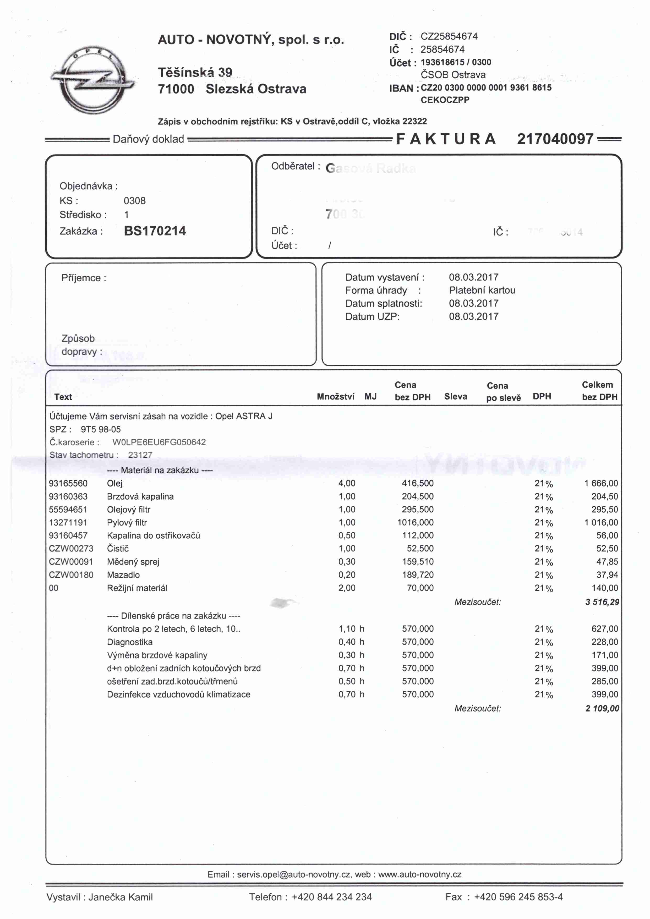 Tak dnes jsem absolovoval 2 garanční prohlídku a na vlastní žádost jsem požadoval překontrolovat klimatizaci a provést desinfekci. Nadále jsem měl podezření na drznutí zádních brzd. Celá procedůra trvala 2 a půl hodiny (nebyl jsem u toho osobně, předal jsem Astru a pak jsem dostal SMS o vyzvednutí. Podrobný rozpis přikládám a koncová cena byla 6807Kč za vše zadní brzdy + klimatizace, byl příplatek cca 1300Kč, jinak bych bez toho platil 5500Kč. Mám najeto 23127km a mám v servisce napsáno pouze drobné oděrky na laku, hold každodení parkování na sídlišti.