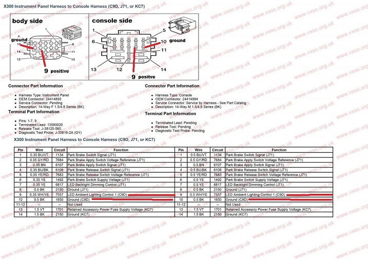 7) Přepojení pinů na okruh vnitřního osvětlení (bude svítit stejně jako tlačítka, lze regulovat jas). Po zasunutí zamáčknout zpět fialovou pojistku. Jelikož mínus má větší otvor, je nutné zakápnutí pinu tavnou pistolí nebo silikonem, aby nedocházelo k jeho pohybu.