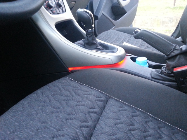 - Koupit pásek LED diod příslušné délky v červené barvě napájený 12 V. Ten lze pak nalepit z vnitřní strany "stříbrného" krycího plastu středové konzole.